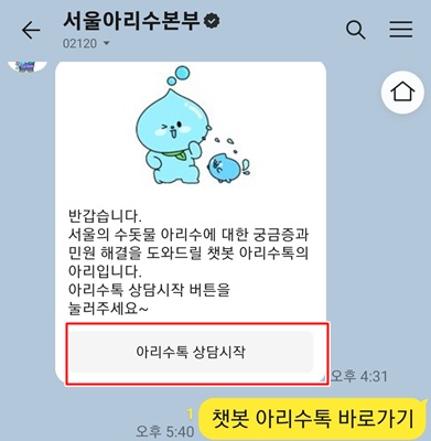 그리고 채팅하기로 가서 아리수톡 상담시작을 누르면 아리수톡으로 화면이 넘어갑니다. 메인화면에 요금조회 탭을 누르거나, 채팅에 요금조회를 검색하면 요금조회를 하실 수 있습니다.